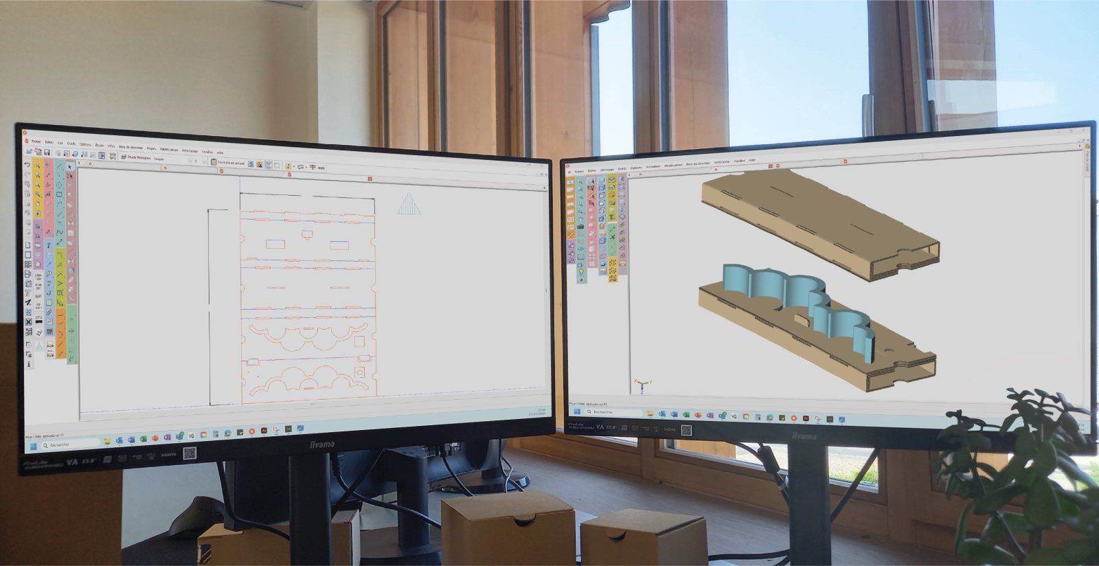 Nous sommes équipés d’une table de découpe grand format, permettant de réaliser des prototypes. Ces derniers servent dans un premier temps à nos conceptrices pour ajuster et valider la conception. Nous réalisons également un prototype pour le client afin qu’il puisse tester, en conditions réelles, l’emballage conçu.