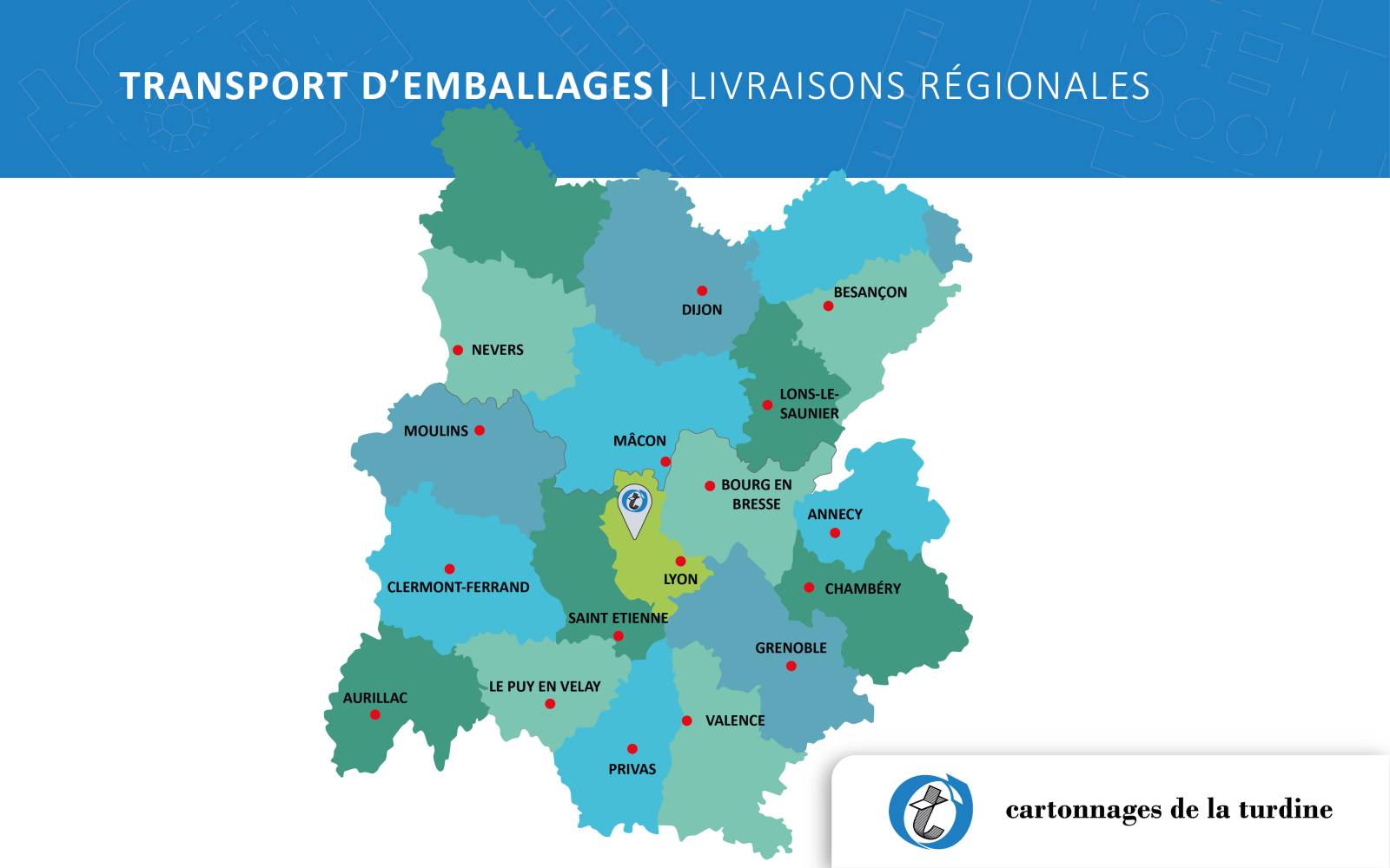 Notre emplacement stratégique au cœur du département du Rhône et à proximité de la Bourgogne-Franche-Comté nous permet d’assurer des livraisons sur ces deux régions, tout en garantissant des conditions optimales de transport pour les emballages en carton ondulé.
